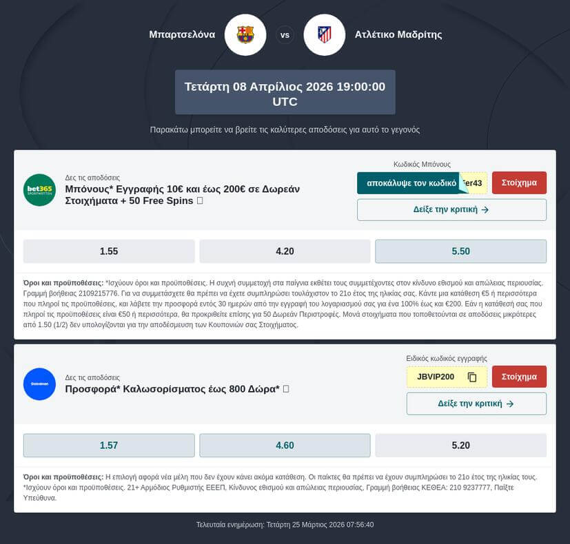 2. Μπαρτσελόνα – Ατλέτικο Μαδρίτης Αποδόσεις